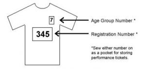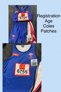 The Registration Numbers are to be worn on the front of the athlete’s singlet or body suit as high as possible. IF the singlet has to be tucked into the pants with the number still showing. The Age Numbers are to be sewn on the left front of the singlet or pants. The Coles patch must be worn on the top right side of the singlet or crop top.
